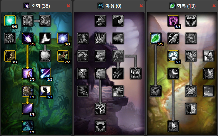 해당 특성으로 찍은 드루이드의 경우 회드(회복 드루이드) 라 불리며 조화, 회복 비슷한 비율로 양분한 특성입니다.