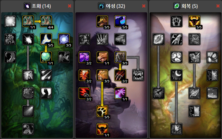 와우 클래식 스타터용으로 구성된 특성으로 조화(14) / 야성(32) / 회복(5) 으로 포인트를 찍습니다.